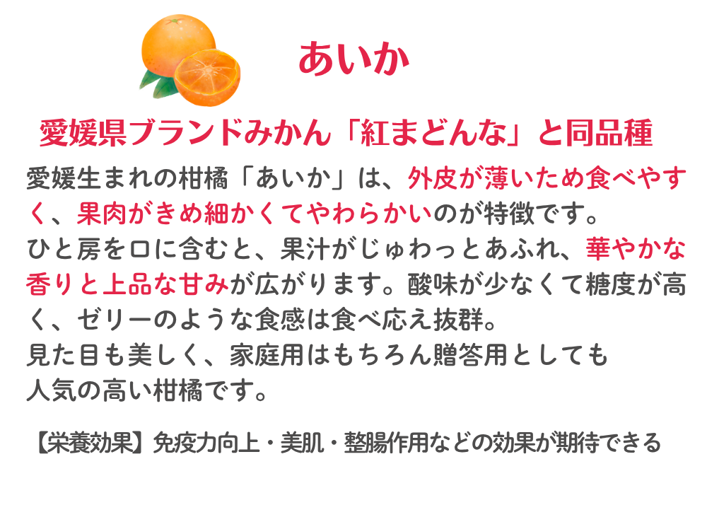 愛媛生まれの柑橘「あいか」は、外皮が薄いため食べやすく、果肉がきめ細かくてやわらかいのが特徴です。ひと房を口に含むと、果汁がじゅわっとあふれ、華やかな香りと上品な甘みが広がります。