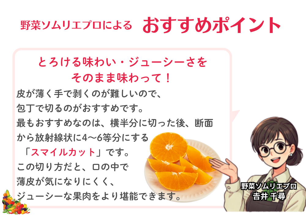 この切り方だと、口の中で薄皮が気になりにくく、ジューシーな果肉をより堪能できます。