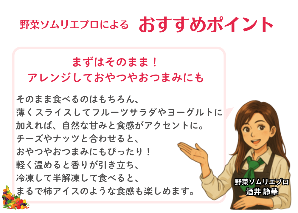 軽く温めると香りが引き立ち、冷凍して半解凍して食べると、まるで柿アイスのような食感も楽しめます。