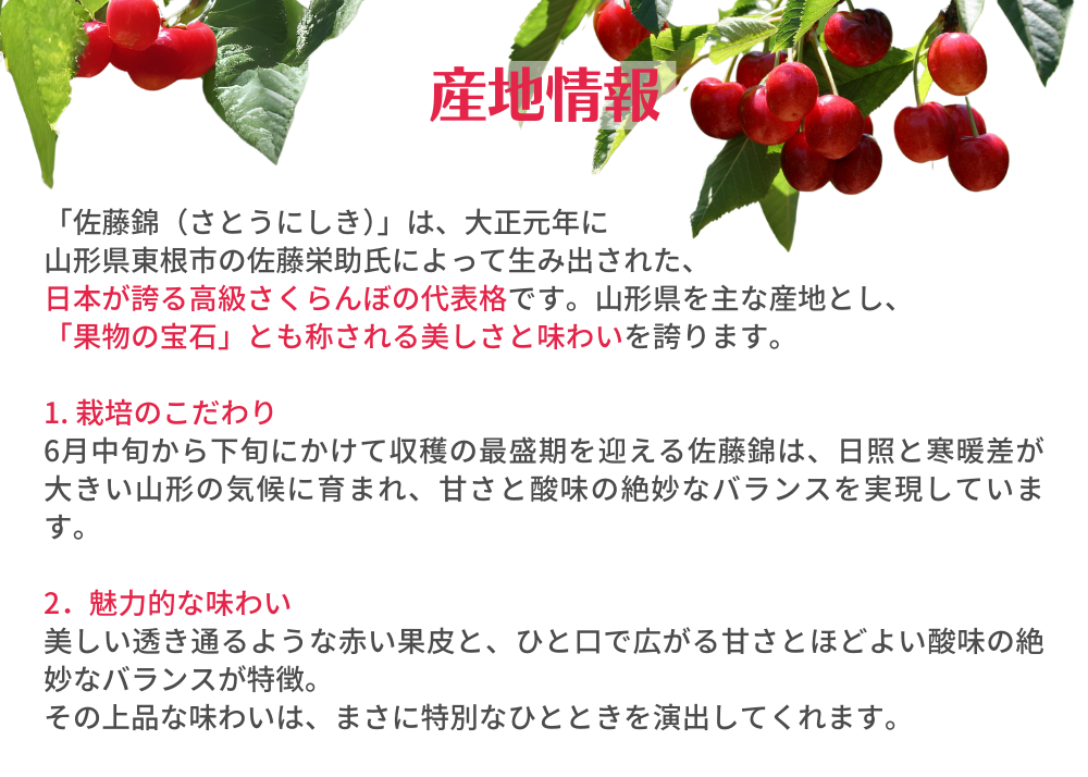 山形が誇る大粒サイズの高級佐藤錦。さくらんぼの中でも「特秀」の商品をご用意!贈り物には最適な最高の逸品です。