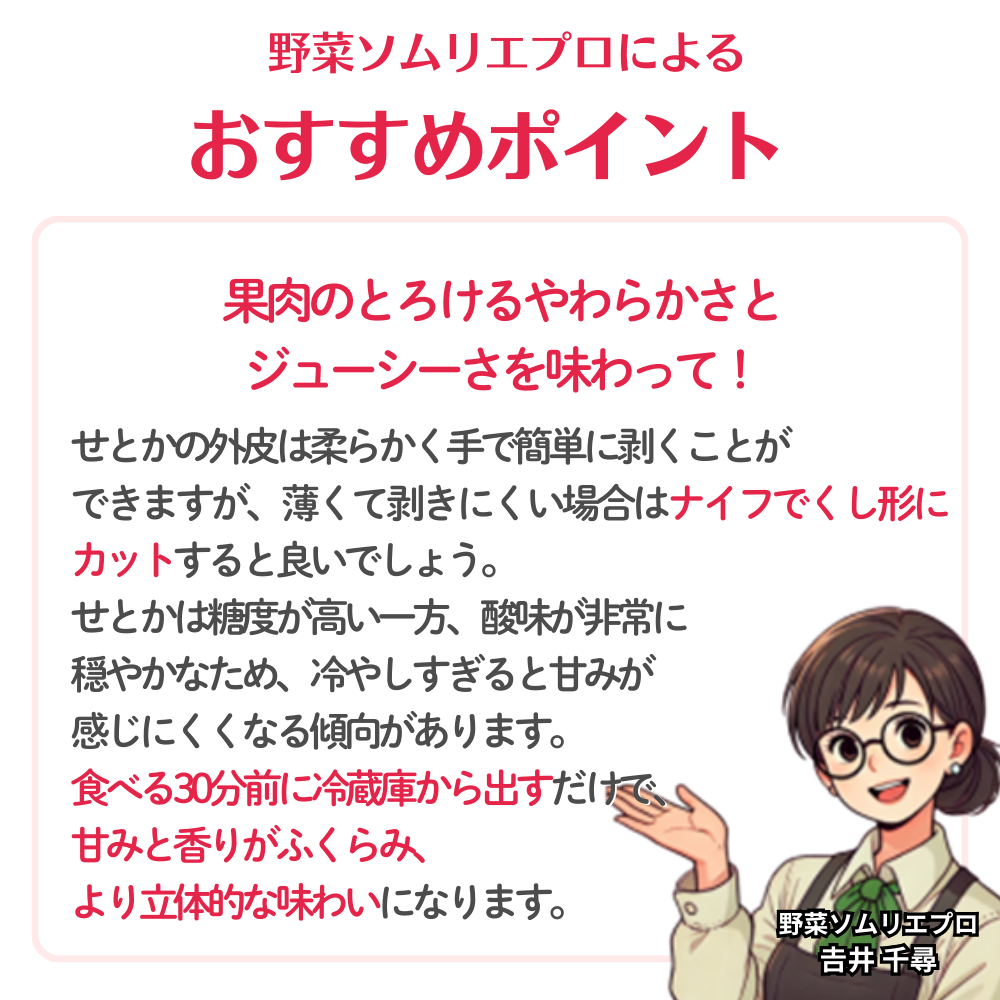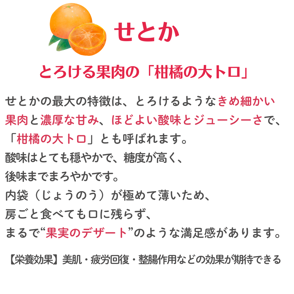 せとかの最大の特徴は、とろけるようなきめ細かい果肉と濃厚な甘み、ほどよい酸味とジューシーさで、「柑橘の大トロ」とも呼ばれています。酸味はとても穏やかで、糖度が高く、後味までまろやかです。