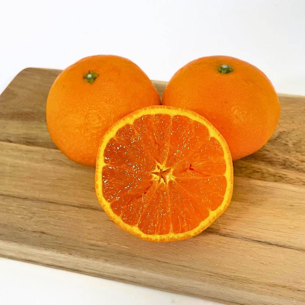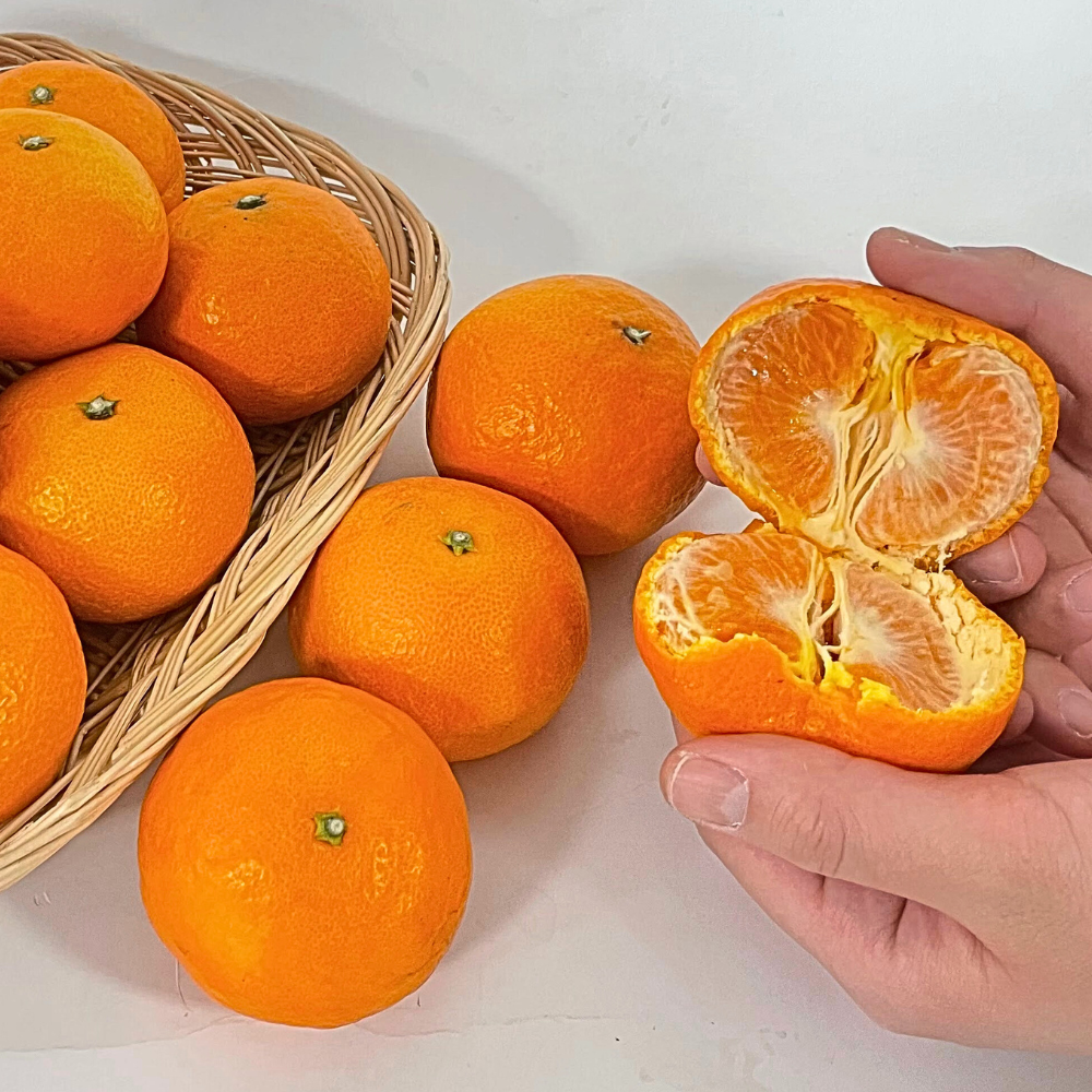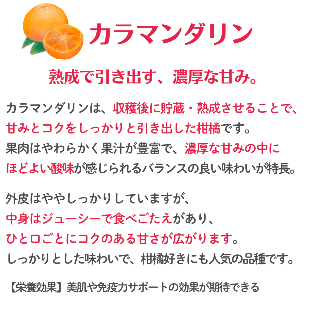 カラマンダリンは、収穫後に貯蔵・熟成させることで、 甘みとコクをしっかりと引き出した柑橘です。果肉はやわらかく果汁が豊富で、濃厚な甘みの中にほどよい酸味が感じられるバランスの良い味わいが特長。