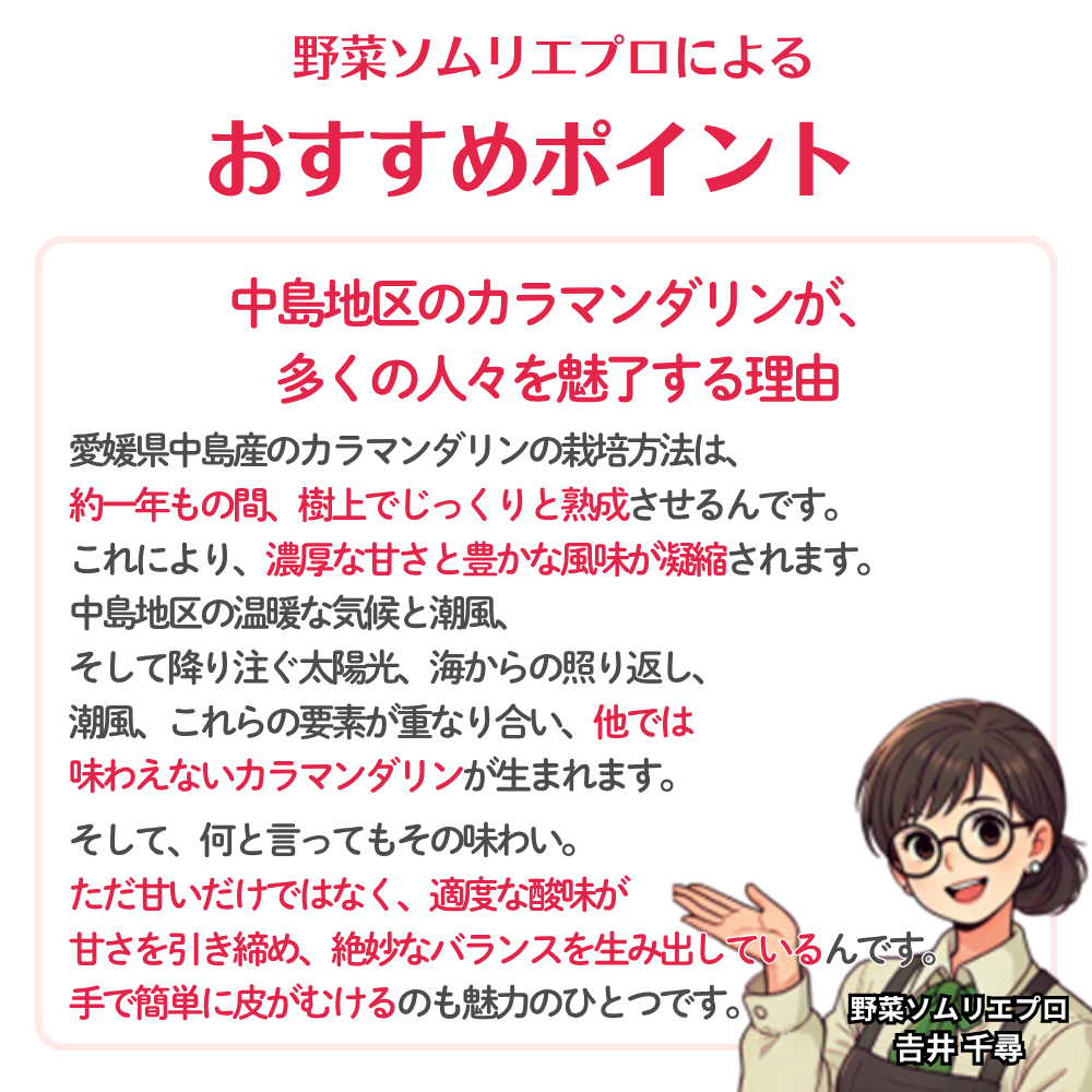 愛媛県中島産のカラマンダリンの栽培方法は、 約一年もの間、樹上でじっくりと熟成させるんです。これにより、濃厚な甘さと豊かな風味が凝縮されます。