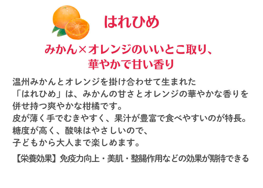 温州みかんとオレンジを掛け合わせて生まれた「はれひめ」は、みかんの甘さとオレンジの華やかな香りを併せ持つ爽やかな柑橘です。皮が薄く手でむきやすく、果汁が豊富で食べやすいのが特長。糖度が高く、酸味はやさしいので、子どもから大人まで楽しめます。