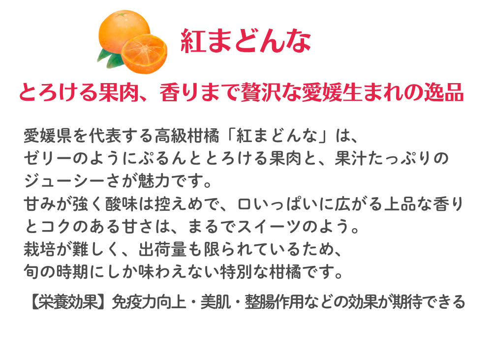 愛媛県を代表する高級柑橘「紅まどんな」は、ゼリーのようにぷるんととろける果肉と、果汁たっぷりの ジューシーさが魅力です。甘みが強く酸味は控えめで、口いっぱいに広がる上品な香りとコクのある甘さは、まるでスイーツのよう。 栽培が難しく、出荷量も限られているため、旬の時期にしか味わえない特別な柑橘です。