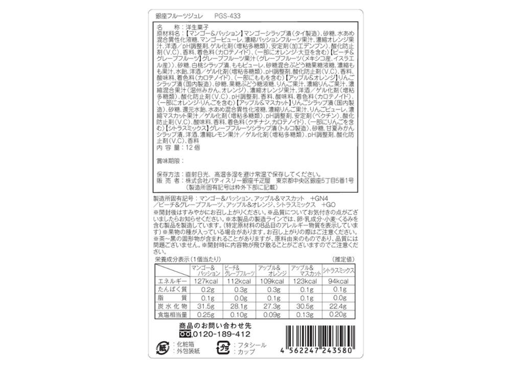 | 内容量 | マンゴー&パッション、ピーチ&グレープフルーツ 各130gx3 アップル&オレンジ、シトラスミックス、アップル&マスカット 各130gx2 計12個 |