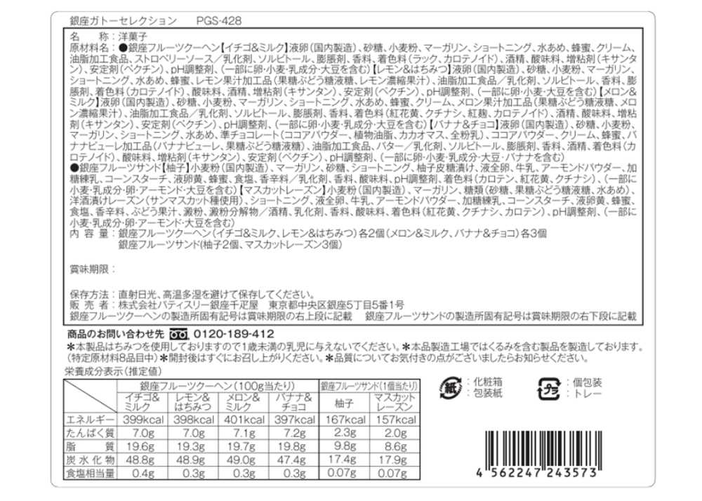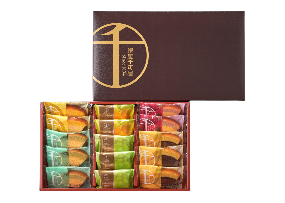 | 内容量 | 銀座フルーツクーヘン(いちご&ミルク・レモン&はちみつ 各2個、メロン&ミルク・バナナ&チョコ 各3個)、銀座フルーツサンド(柚子 2個、マスカットレーズン 3個) |